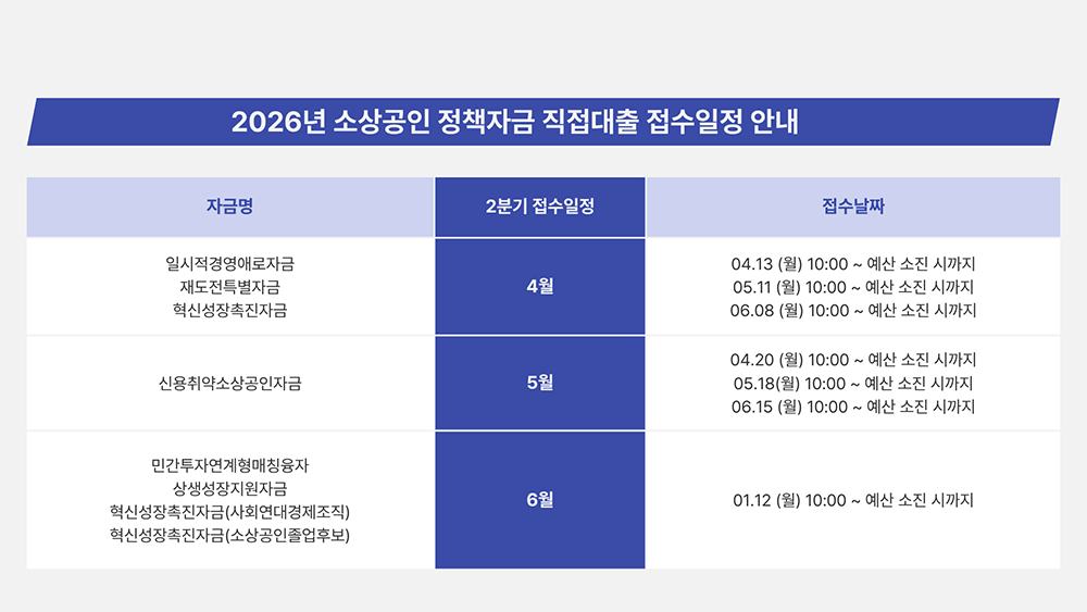 신용취약소상공인자금 : 04.20(월), 05.18(월) 10:00, 06.15(월) 10:00 ~